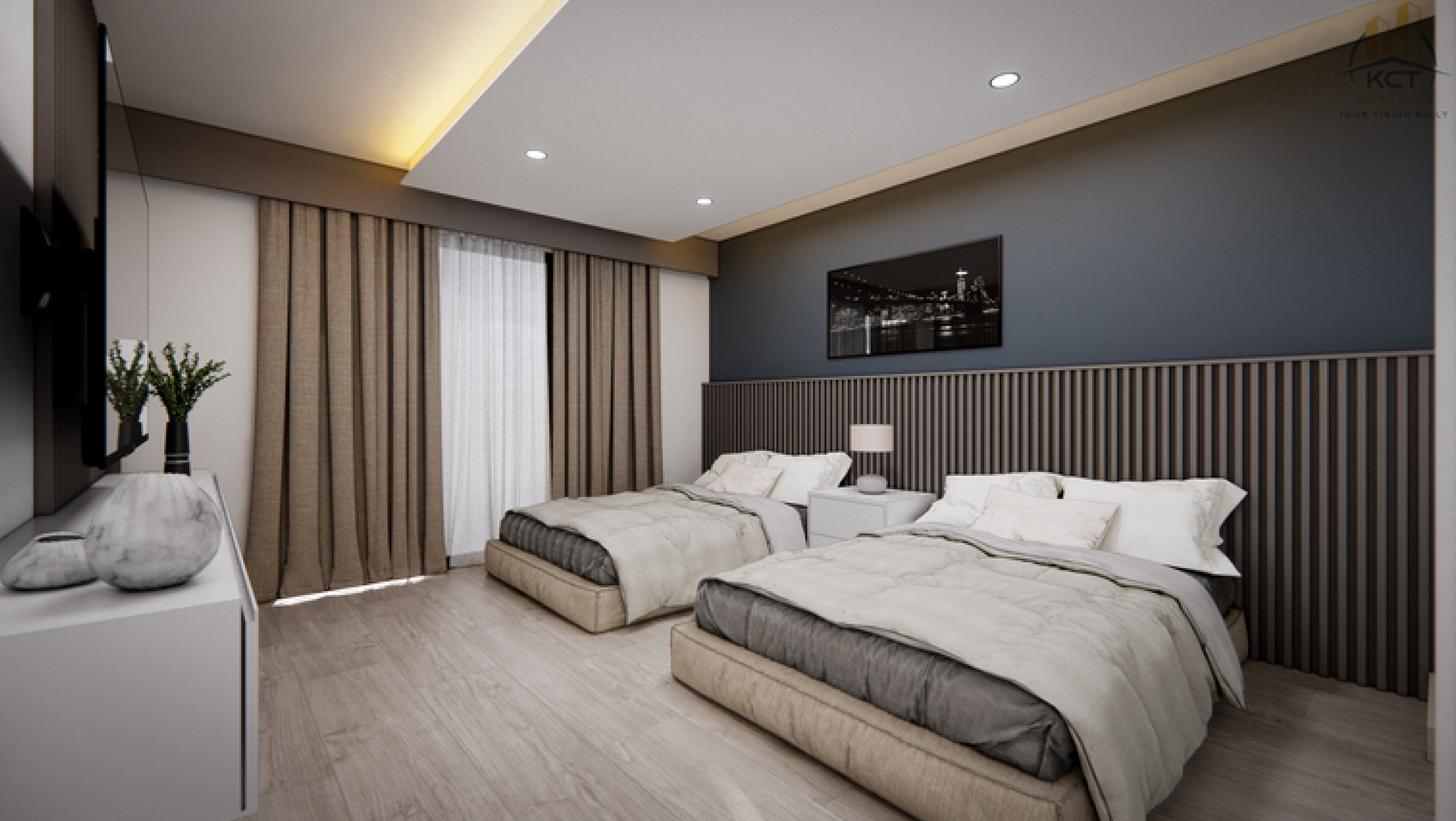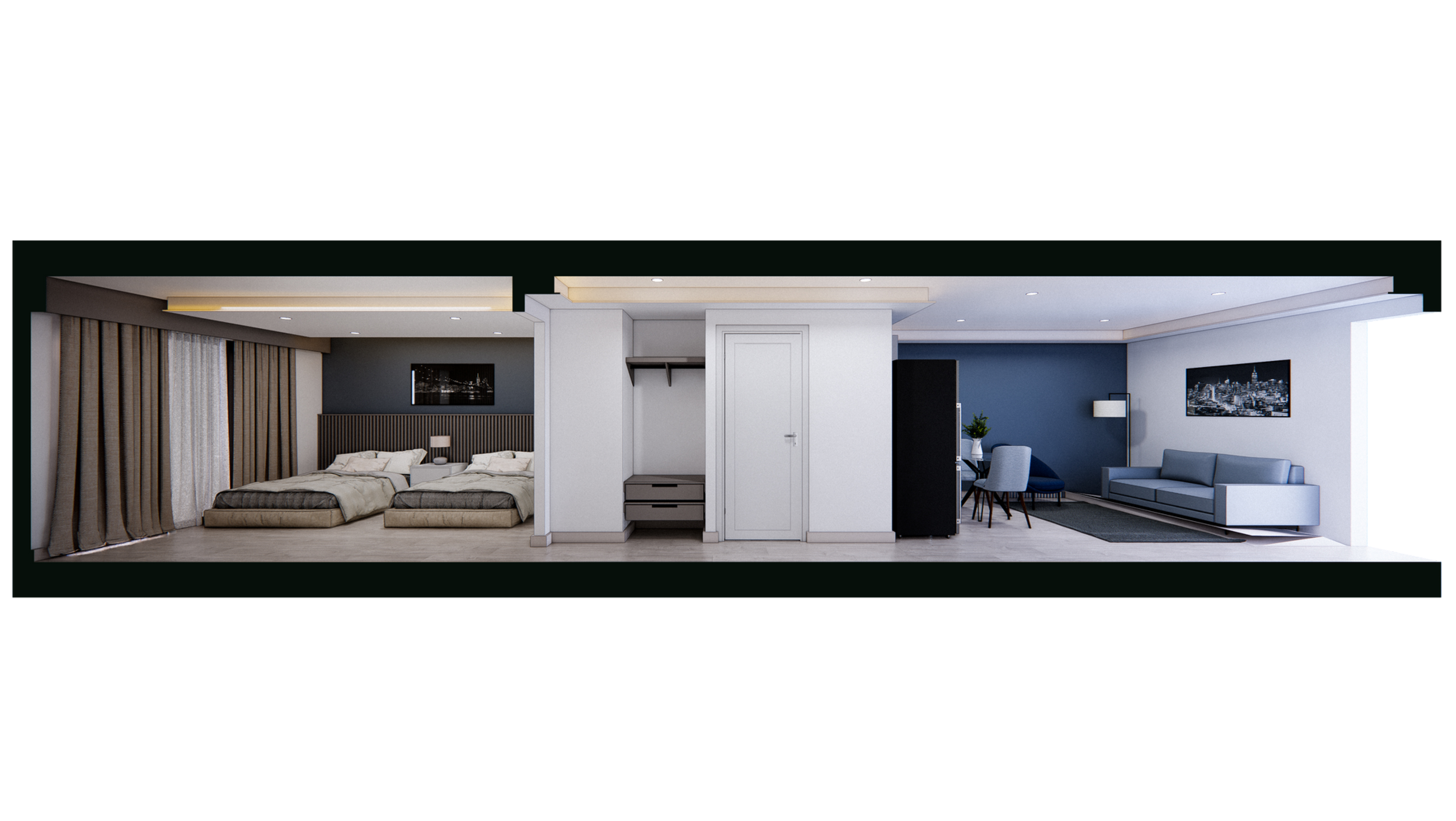 - Recámara: Un espacio tranquilo con una cama king-size y un armario.