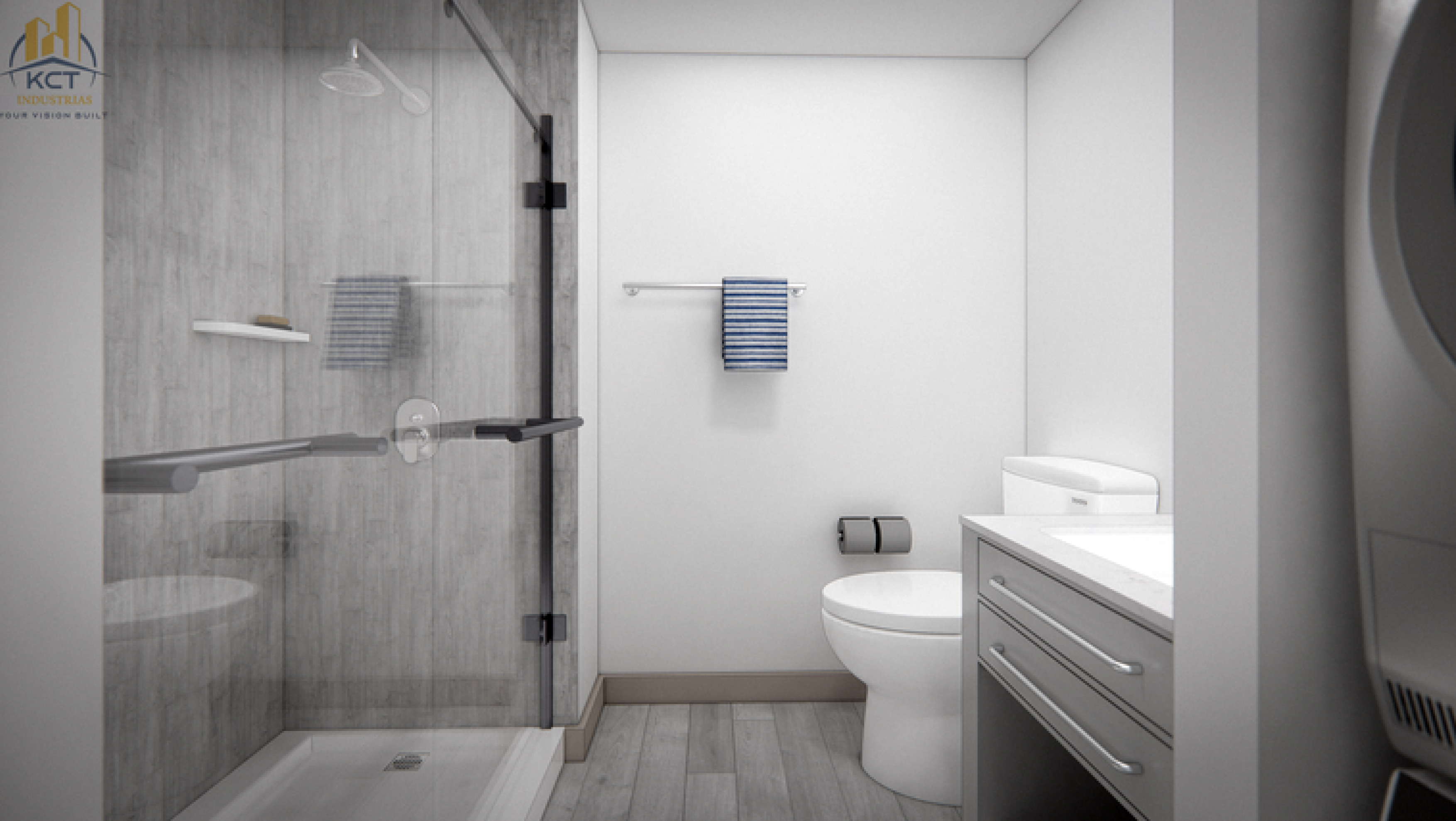- Baño: Un baño moderno con ducha, lavabo e inodoro.